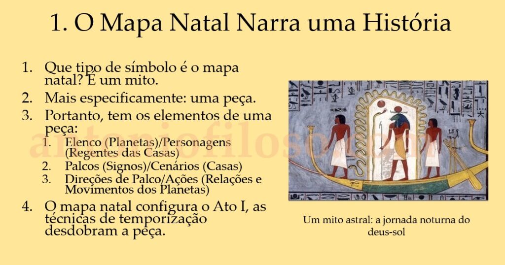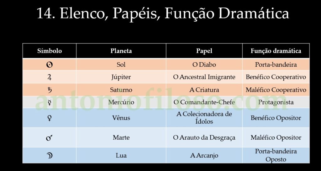 Interpretação dos planetas como personagens e dos signos como cenários de um drama pessoal, oferecendo um retrato dramático da leitura do mapa natal, útil para gravar as posições dos astros e refletir sobre o mapa.