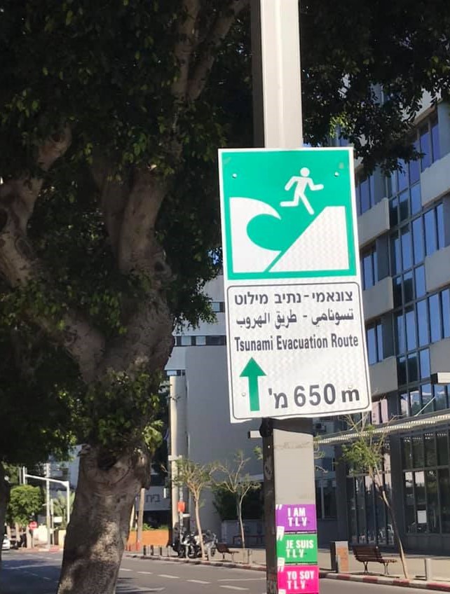 As placas são uma anomalia na cidadela do último homem. Em meio à tranquilidade da praia e dos arranha-céus de uma economia pujante, aparecem avisos de uma catástrofe que se avizinha. As placas foram colocadas em 2017, o que significa que quando cheguei á cidade os encontrei já prontos e pensei que fossem tão antigas quanto toda a sinalização de trânsito. Mas até hoje nem todos os telavivenses as entendem. Certa vez um morador me comentou que ele não tinha certeza de seu sentido, talvez fosse uma espécie de crítica social. Na realidade, foram uma resposta da prefeitura a um estudo sobre o risco de um possível maremoto. O último chegou às praias em 1956 como consequência de um terremoto nos mares gregos de Homero e tsunamis ocorrem por volta de uma vez ao século no mediterrâneo. A prefeitura pensou por bem se precaver contra atos divinos.